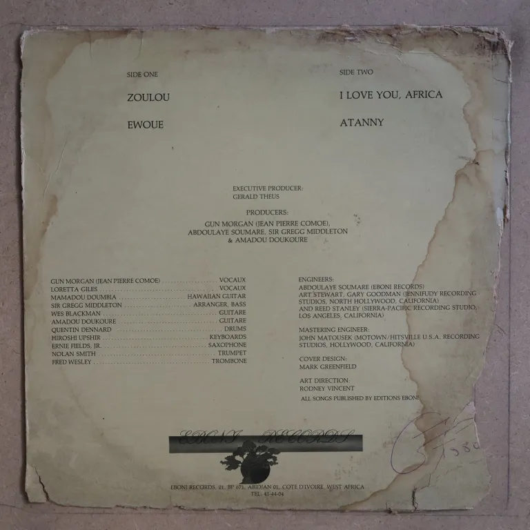A downtempo afrosynth / boogie disco tune w/ children spoken word, and a solid dub reggae tune too. Sleeve has aging & wear, large bite along spine, split on all top & bottom, beige water damage, writings on back, record plays with reasonable to very reasonable noise from marks