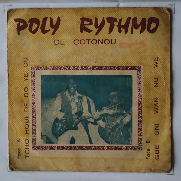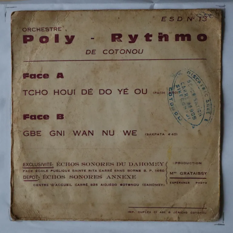 A deep afrofunk psych winner & a pachanga, both with solid guitar solos by Poly Rythmo's bandleader Melome Clement. Sleeve has dirt & aging, red stain on front, shop stamp on back. Writings, dirt & peel off on labels, record plays w/ constant strong to reasonable noise from serious marks, F to G, less noisy on second part of sides, a skip on intro to the afrofunk track (clip 1).