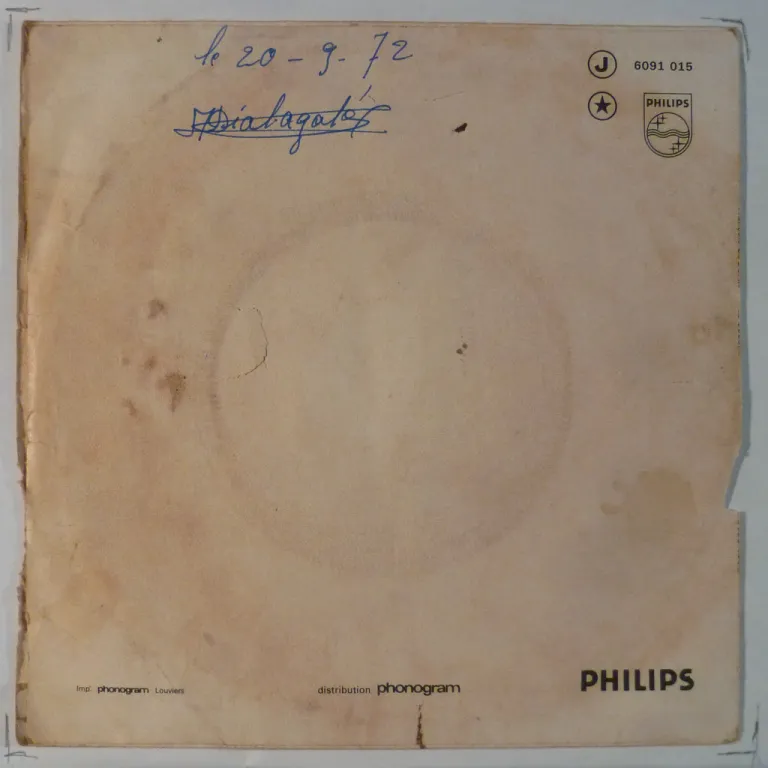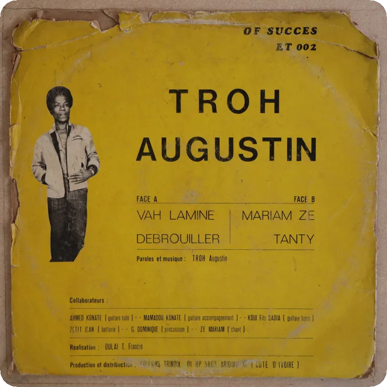 Afro funk meets French pop on this double sider by the Ivory Coast singer. Sleeve has dirt wear & aging, distributor stamp on front, 1" horizontal tear on spine & small bite, also 2 tears on top front, writings & 1" round tear on back, record has marks and plays really well with only issues on intros (check clips)