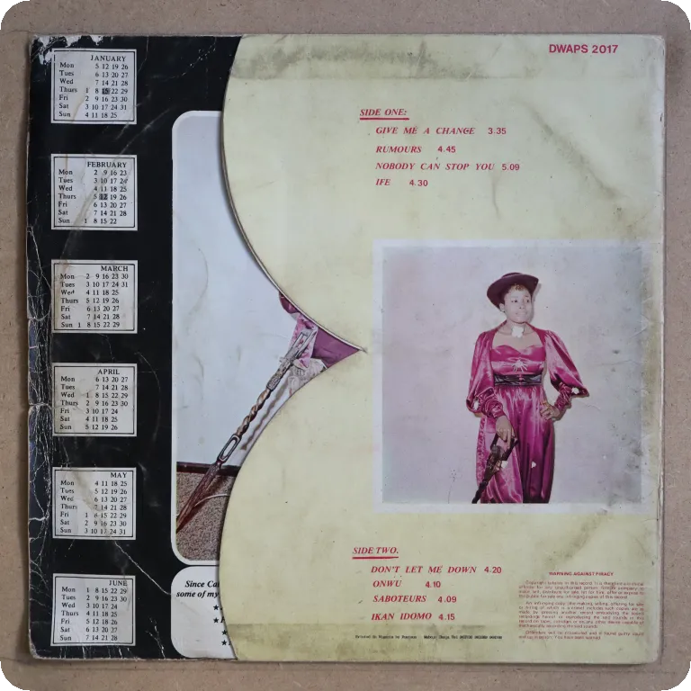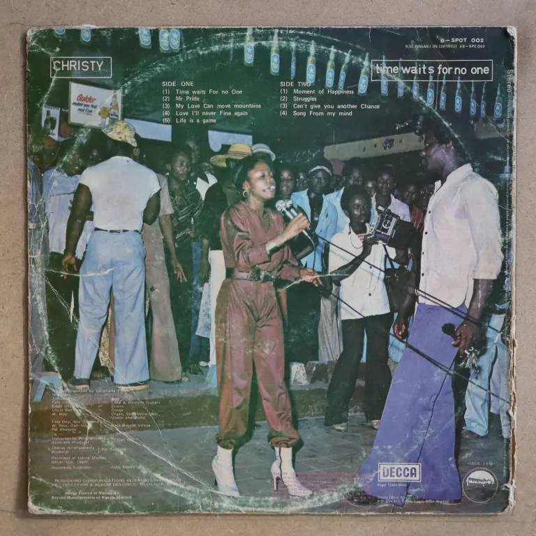 2 solid afrobeat tracks "Mr Pride" & "Struggles" as recorded by the funky Nigerian singer, Aging & dirt wear on cover, page 2 of gatefold cover is missing, creases; ringwear, 5" split on spine, rubber stamp on A label, writings on B label, record plays w/ reasonable to light noise from marks