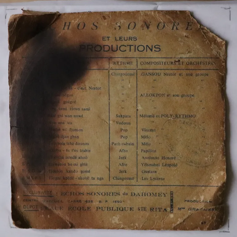 Psychedelic afrobeat & downtempo afrolatin pachanga on this single rarity by the Kings of Benin. Sleeve has serious wear, creases, strong dirt, 5" split on bottom & spine, bite on top spine corner, peel off, shop stamp on back, dirt & writings on labels, record has strong to reasonablenoise from numerous marks, F to weak VG-.