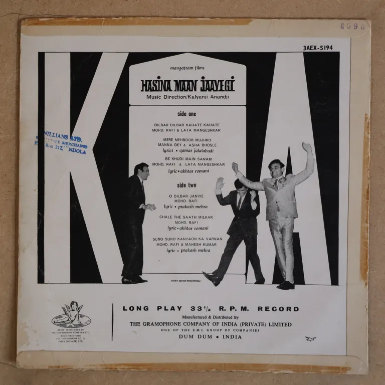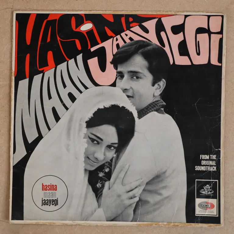 Cover only, no vinyl. Sleeve has wear & dirt, rubber stamp on back, 9" split Hasina Maan Jaayegi along top & 11" split & glue residue along bottom, 2,5" split on spine, some peel off on back, bump on mouth