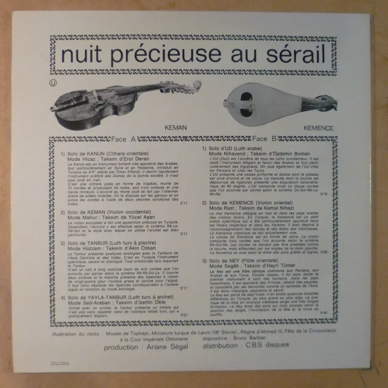 Cithar, Keman violin, Oud & flute solo tunes as recorded on field in Istanbul, Turkey by French record label. Minor wear on cover, vinyl in top shape.