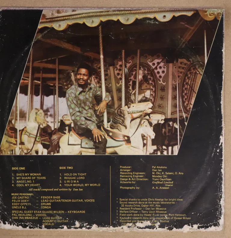 One of the very best roots reggae tunes to come out of Nigeria "she's my woman", also 2 other solid reggae tunes, sleeve has aging & dirt, ringwear, peel off on bottom & along spine , narrow bite & 8" split on spine, bump on bottom mouth, small hole on bottom front, , 3" split on bottom, record plays w/ light to hardly noticeable noise, VG to solid VG+ despite marks.