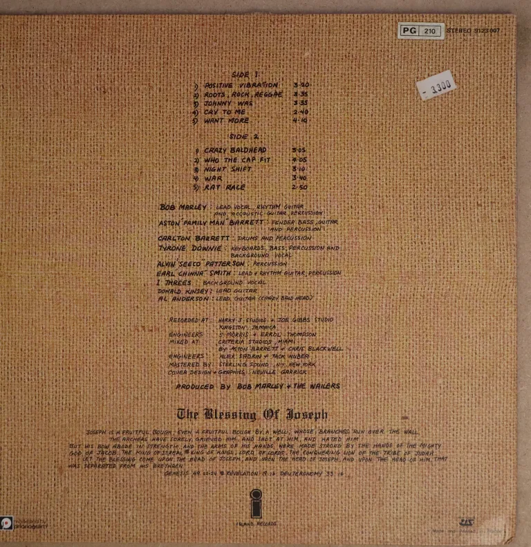 Roots reggae masterpiece by the king of reggae, features such hits as War, Crazy baldhead, Rat race, etc. Sleeve has minor wear, shop sticker on front, price sticker on back, record has light to hardly noticeable noise from marks, ranges from weak VG to VG+ depending on parts.