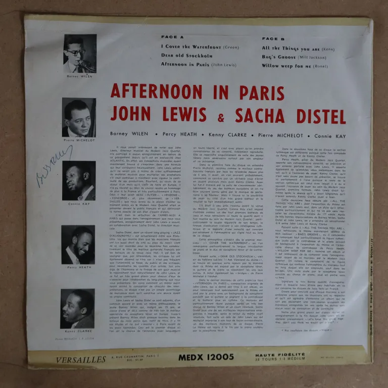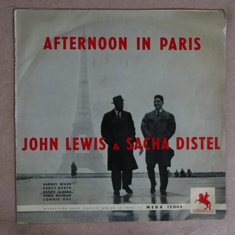 Hard bop led by the MJQ pianist & leader & French guitarist Distel w/ backing by such greats as Barney Willen, Percy Heath, Pierre Michelot & Connie Kay. Sleeve has aging & creases, some warp on corners, wear around center holes, record has many marks, including clicks, groove wear