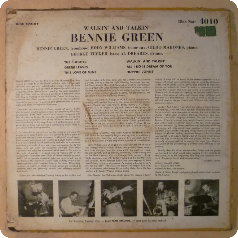 Post bop & hard bop numbers by the trombone player on this very scarce Mono 1st press with deep groove, plastylite, 47 west 63rd NYC address & no R on labels. Sleeve has wear & aging, strong dirt