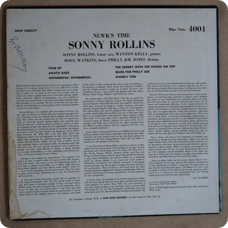 Mono 47 W. 63rd NYC label with "inc" "r" and deep groove. RVG, 9M, and Plastylite ear in deadwax, sleeve is missing, large peel off, dirt wear & earth from termite attack on A side label, minor dirt on B side label. Record has reasonable noise to hardly noticeable noise from marks depending on parts, side B is the crackiest.
