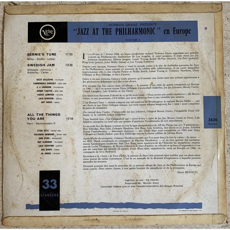 Hard bop live sessions suprvised by the legendary Norman Granz with some of America's best musicians. Sleeve has some aging, dirt, ringwear, on back, record has very reasonable to very light noise depending on parts from marks, VG- to VG.