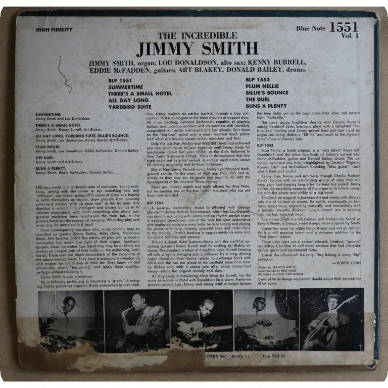 Classic hard bop blues jazz numbers by the organ genius including a version of Summertime recorded with Donaldson, Burrell, Bailey, Blakey & McFadden. Late 50's Mono 47 west 63rd plastylite with R