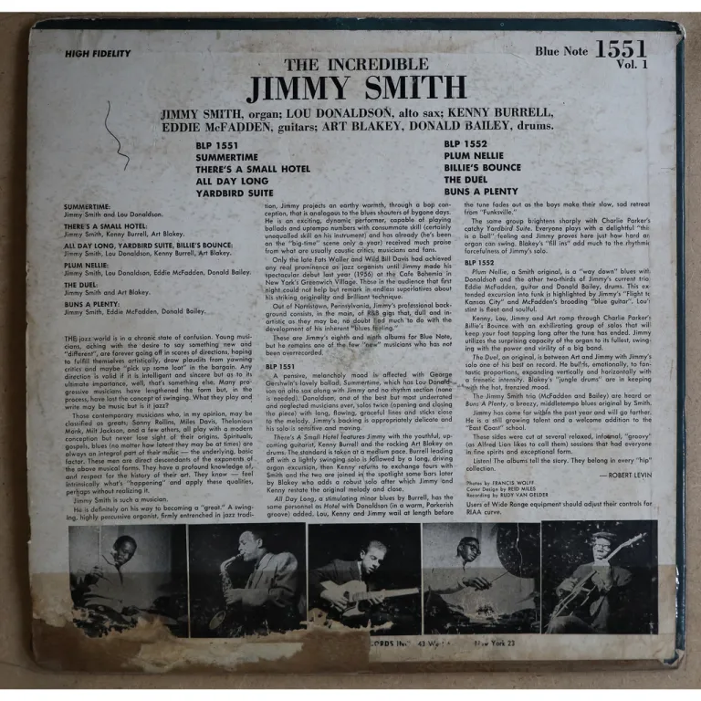 Classic hard bop blues jazz numbers by the organ genius including a version of Summertime recorded with Donaldson, Burrell, Bailey, Blakey & McFadden. Late 50's Mono 47 west 63rd plastylite with R logo & DG on A side label, no R logo no DG on B side label, RVG etched in runout grooves. Sleeve has large peel off & transparent tape along bottom, aging & dirt, 0,5" split on top, writings on back & labels, constant reasonable noise from numerous marks.