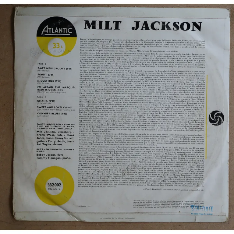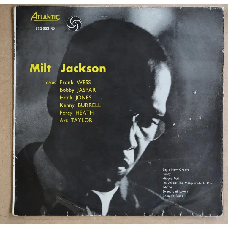 Hard bop masterpiece recorded by the vibraphone player with Wess, Burrell, Art Taylor, Hank Jones, Jaspar, Flanagan & Percy Heath. Alternate cover French press to his Bags & flutes LP, sleeve has aging & dirt, several small scratches & an air bubble underneath plastic film on front glossy cover, creases, writings & shop stamp on back, shop sticker on A side label, record has marks & constant reasonable to light noise depending on parts, weak VG- to weak VG.