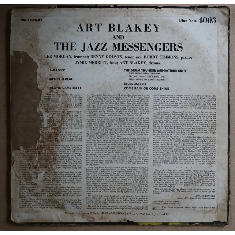 Hard bop classic masterpiece, Mono 47 west 63rd st on A label & New York USA on B label, no DG, plastylite, RVG stamped in runout, 43 West 61st address on back cover, so likely pressed circa 60-62. Very strong wear on cover, large peel off along mouth on back, large light brown water damage a mold wear on back, small peel off on front, creas & warp on top spin corner, 2,5" split on top, blurry labels. Record plays w/ strong to very light noise, crackier on first tune of each side, ranges from weak to very solid VG-