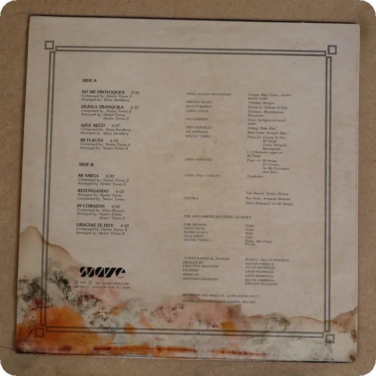 Check the deep latin jazz fusion "azul seco" on this otherwise excellent crossover charanga / latin jazz fusion descarga masterpiece by the Colombian flutist. Sleeve has small peel off on front, large