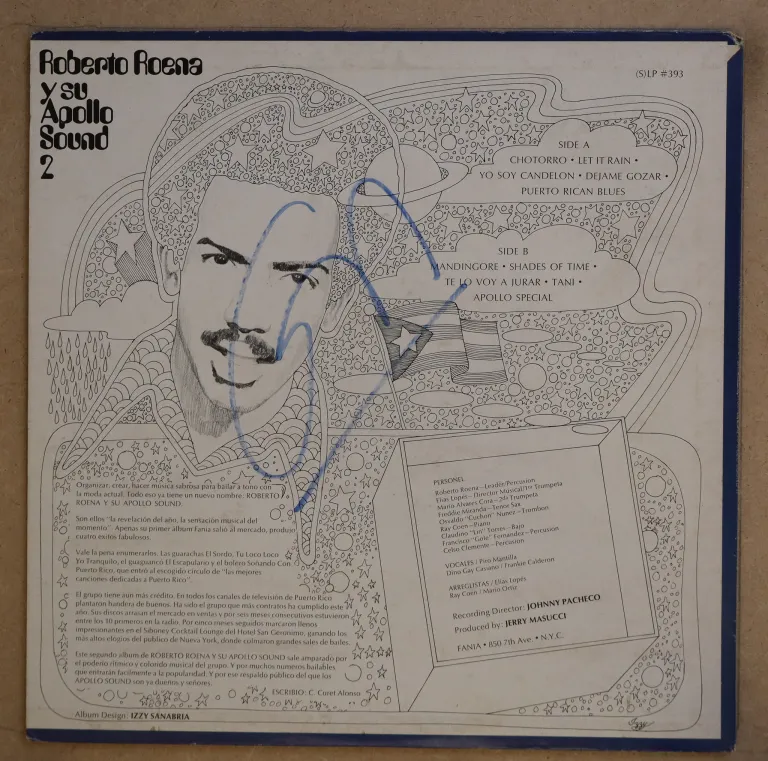 Hard guaguancos, boogaloo & descarga jazz tracks on this outstanding debut LP by salsa's bad boy. Fania clouds label stereo. Sleeve has peel off along mouth, large writings on back, record plays