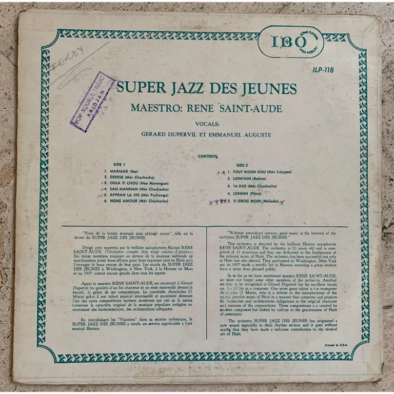 Check the guaracha "oula ti chou", the hybrid pachanga "apran la vie" & the guajira "ti grog moin" on this Haitian lp that features several hybrid latin oriented track. Monochrome press. Sleeve w/ light dirt & wear, split on all bottom, 4" split on top, shop stamp & writing on back, record plays w/ quite reasonable to light pressing hiss, worse one being B5 "ti grog moin".