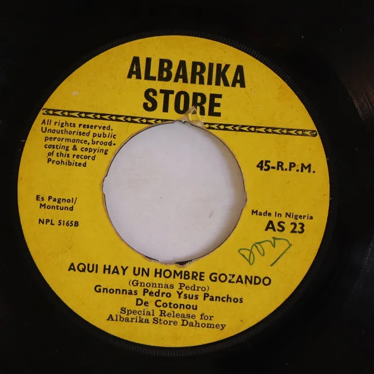 A cover of the 50's tune made famous by the Cuban charanga America del 55 as recorded by the Beninese singer. Surely among his rarest releases ever, never shows up ! Labels have writings. Record plays w/ light to hardly noticeable noise despite visible marks on the standout latin tune, the rumba on A side is a bit noisy, VG-