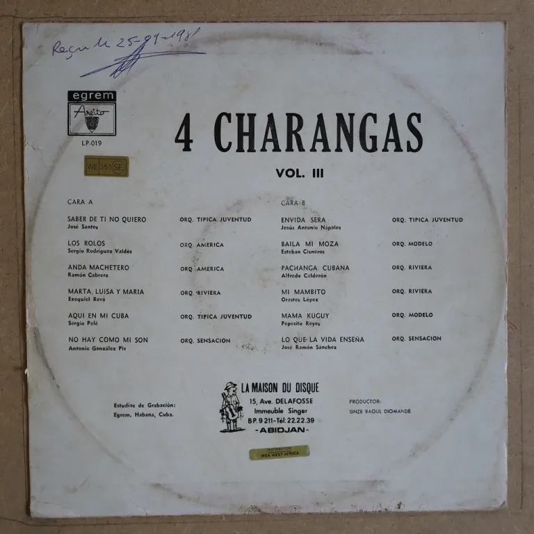 Afrocuban charangas on top on this scarce compilation specially released with Areito for the African market by an Ivory Coast producer. Sleeve has ringwear, aging & dirt, mini bite on top seam, writings, some peel off along mouth, record w/ light marks, plays really well w/ light noise in parts to no noise most of the time.