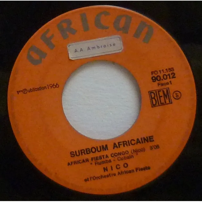 A Cuban influenced son double sider rarity out of Congo recorded by the legends, sticker & light dirt on labels, record has numerous marks & constant reasonable noise.
