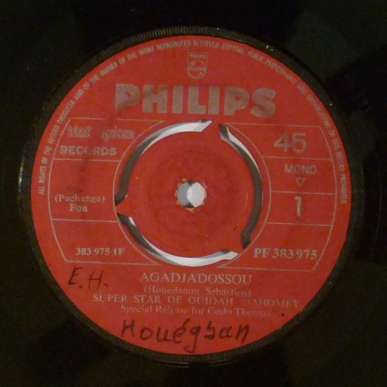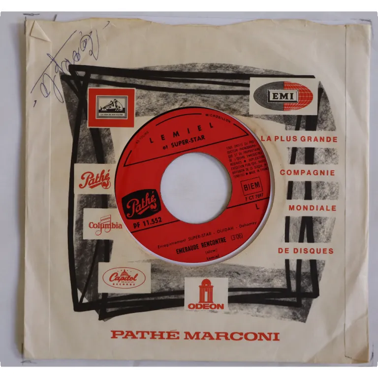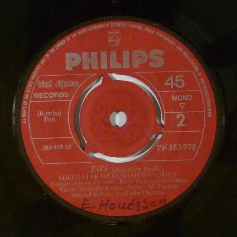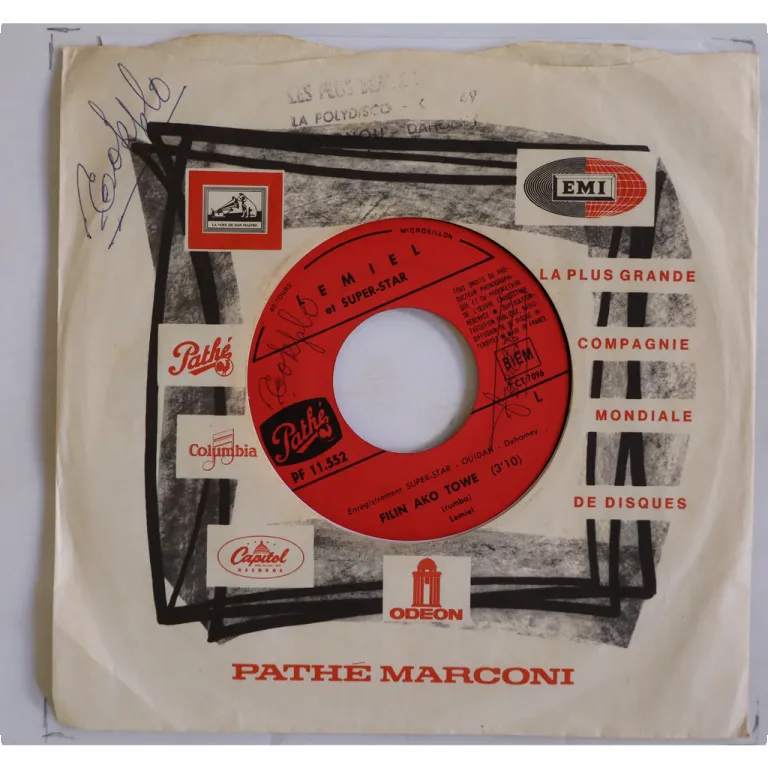 A Cuban influenced rumba & a bolero by this Benin singer, generic pathe sleeve has some aging & dirt, writings on cover & A label, shop stamp & creases, light to hardly noticeable noise from marks &