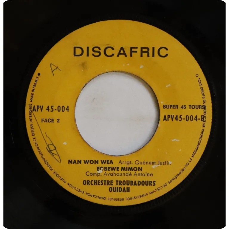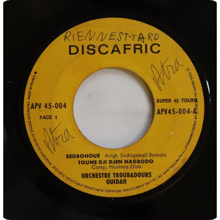 A deep afro folk / hypnotic sato style tune on this scarce release by the Beninese group, noisy on intrto from marks for about 30 seconds, otherwise just very light noise. Writings on labels.