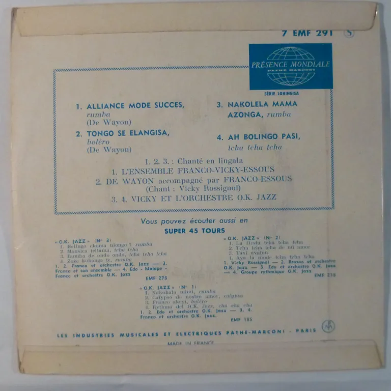 Congolese cha cha cha, bolero & 2 rumbas as recorded by L'ensemble Franco-Vicky-Essous, Dewayon w/ Franco-Essous & Rossignol & Vicky & Orchestre OK Jazz, and originally released on Loningisa. Sleeve has some light aging & dirt, record plays greatly, sweet copy indeed.