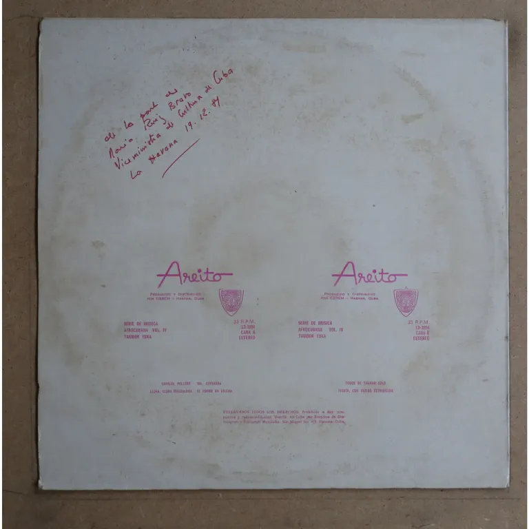 Afro Cuban percussion & voice piece specially released on limited 1000 copies edition as a Varadero pre festival gift to visitors. Never shows up in this precious version. Sleeve has a bit of dirt, autographed by Cuba's culture vice minister on back, record in top shape with minor stocking wear & only very occasional very light noise.