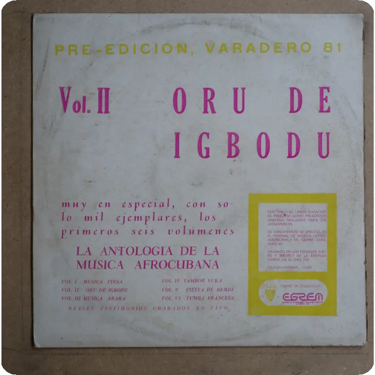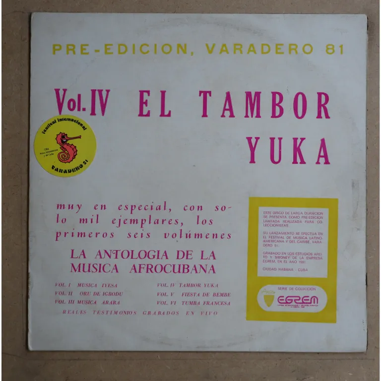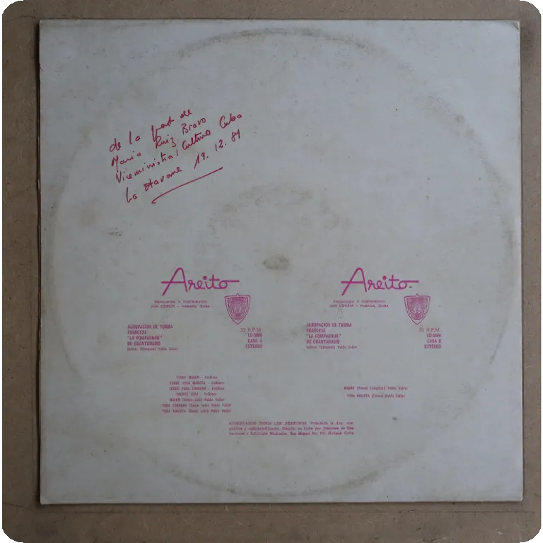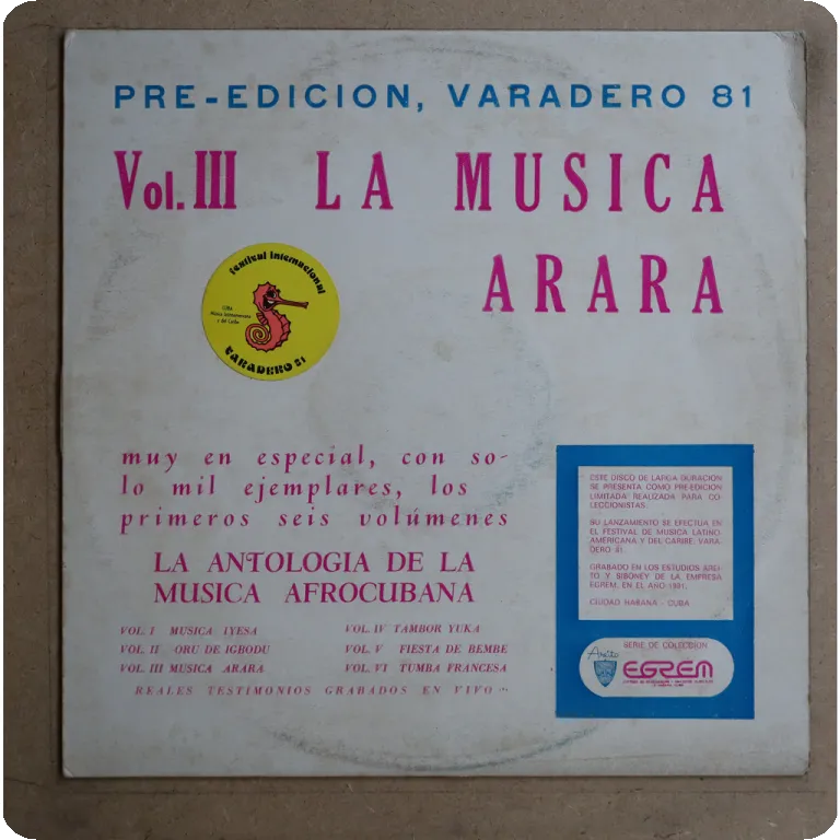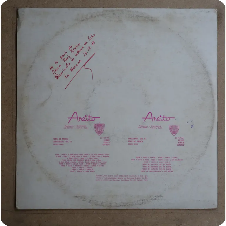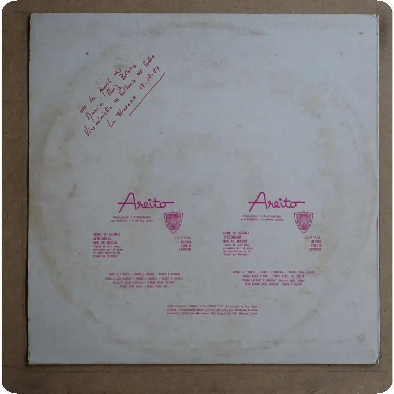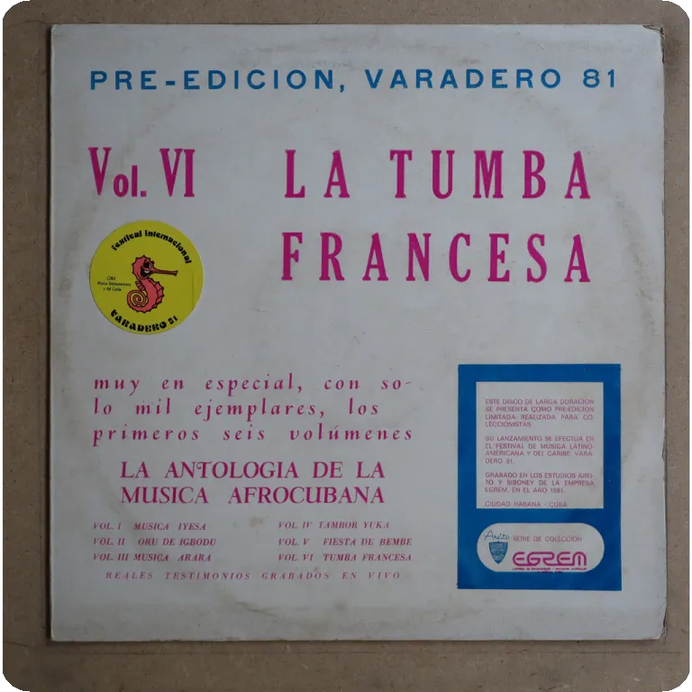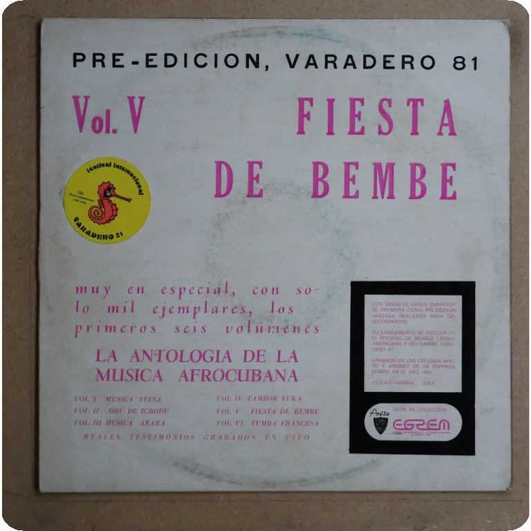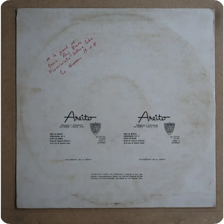 Afro Cuban percussion & voice piece specially reissued on limited 1000 copies edition as a Varadero pre festival gift to visitors. Never shows up in this precious version that was not listed on