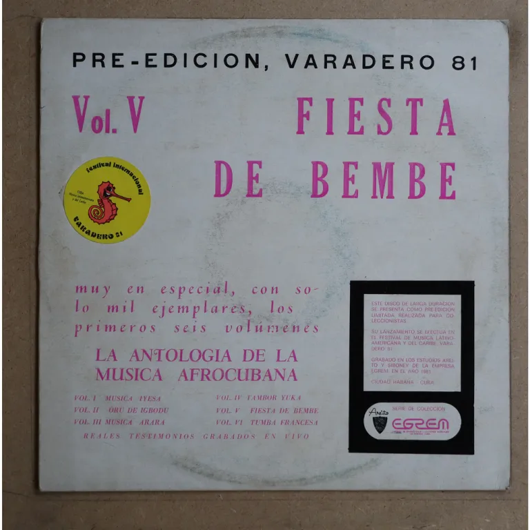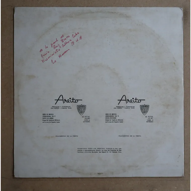 Afro Cuban percussion & voice piece specially released on limited 1000 copies edition as a Varadero pre festival gift to visitors. Never shows up in this precious version, not listed on discogs until I've added it. Sleeve has a bit of dirt, light ringwear, autographed by Cuba's culture vice minister on back, record in top shape with minor stocking wear & only very occasional very light noise.