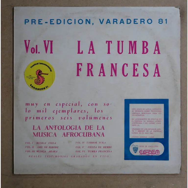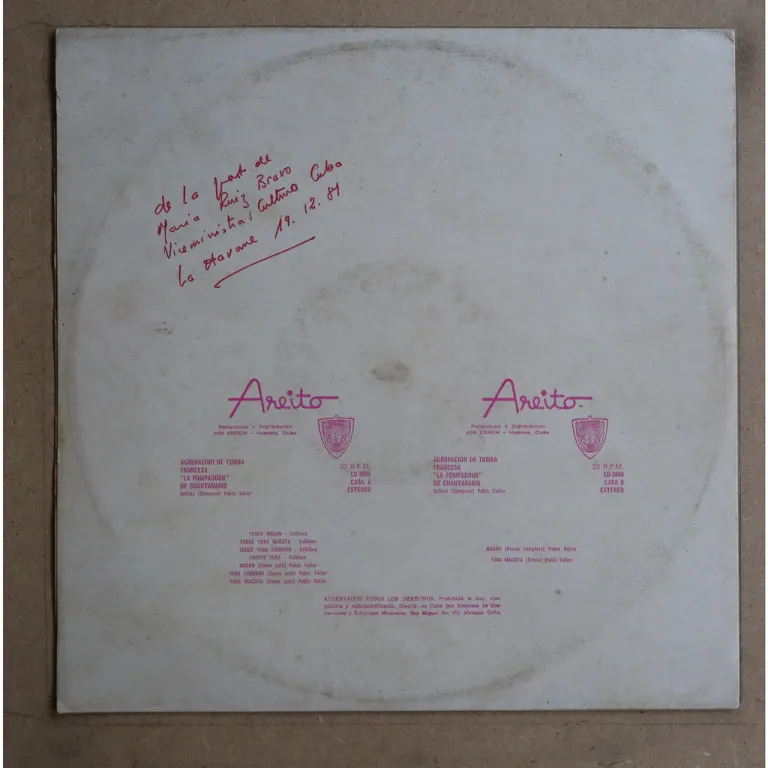 Afro Cuban percussion & voice piece specially reissued on limited 1000 copies edition as a Varadero pre festival gift to visitors. Never shows up in this precious version that was not listed on discogs yet. Sleeve has a bit of dirt, autographed by Cuba's culture vice minister on back, record in nice shape with stocking wear & light to hardly noticeable noise, ranging from VG to VG++ depending on parts.