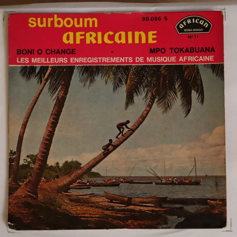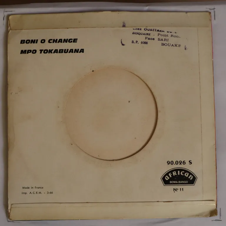 Sweet bolero with sax & guitar solos & a rumba on this scarce release by the legendary Congolese group, sleeve with aging & dirt, writings on labels, shop stamp on back, record has reasonable to light noise