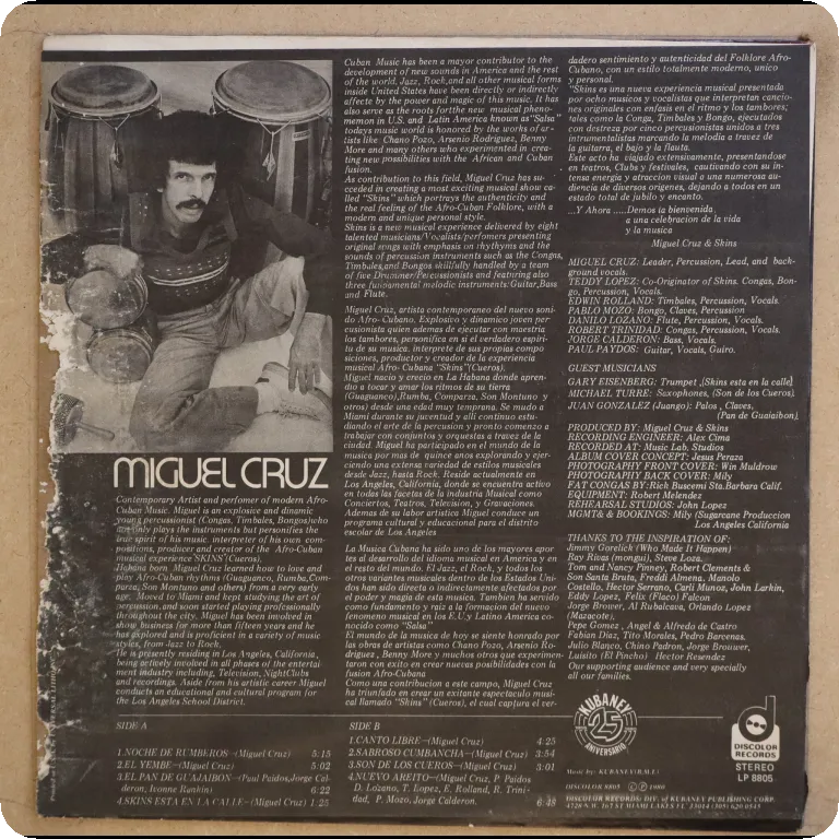Salsa dura tipica & descargas by California based Cuban percussionist. Sleeve has peel off along mouth, light dirt on labels. Record plays greatly.