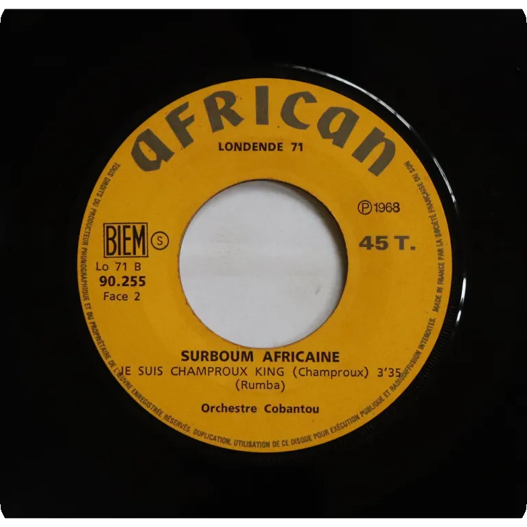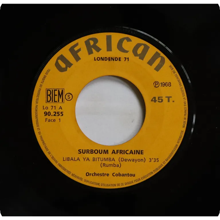Solid afro latin laid back track on this Congolese single, guitar & sax solo. Also has a rumba tune. Sleeve has some aging & dirt, writings on back. Record has reasonable to light though constant noise from numerous marks