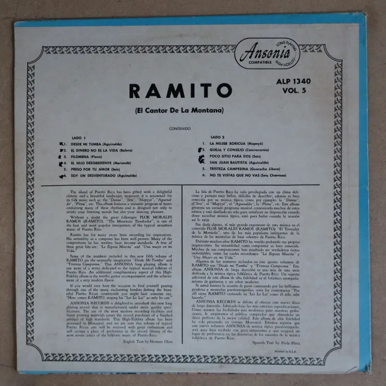 Deep & raw jibaro music out of Puerto Rico's countryside, includes guaracha jibara, seis & seis chorreao, aguinaldos, bolero, guaracha, mapeye, controversia & plenas as recorded by one of the masters of the genre. Sleeve has very minor wear, plays greatly w/ minor occasional noise.