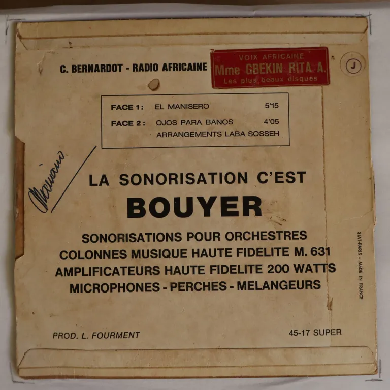 Senegal goes latin on this Cuban son super scarce double sider by the Senegambian artist. Sleeve has aging & dirt, creases, shop sticker, writing, stain & dirt on back, record plays w/ constant reasonable noise from marks