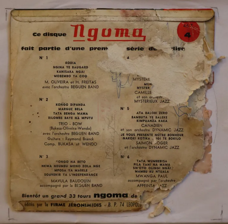 Congolese cha cha cha & rumbas as recorded by one of Ngoma label's proeminent figures. Sleeve has large bite along spine, strong dirt & aging, large peel off & writings on back, writings on labels, peel off on B side label. Record w/ constant strong noise from numerous marks.