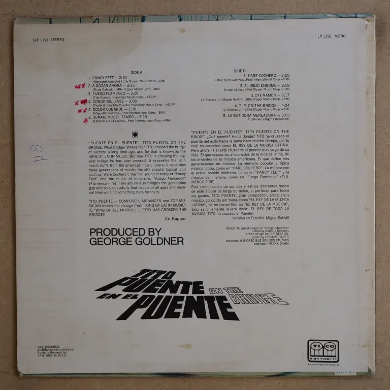 Latin soul "Hit the bongo" & "Watchit", salsa dura "Pa'lante" & son montuno salsa style on this masterpiece recorded by the timbalero. Original mono stiff press. Some wear on cover, small writings on