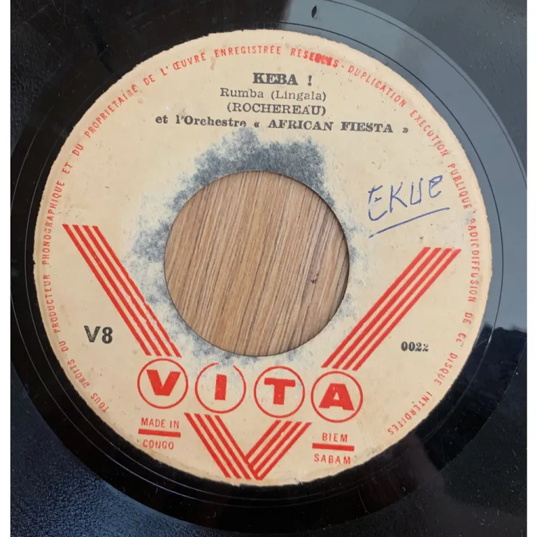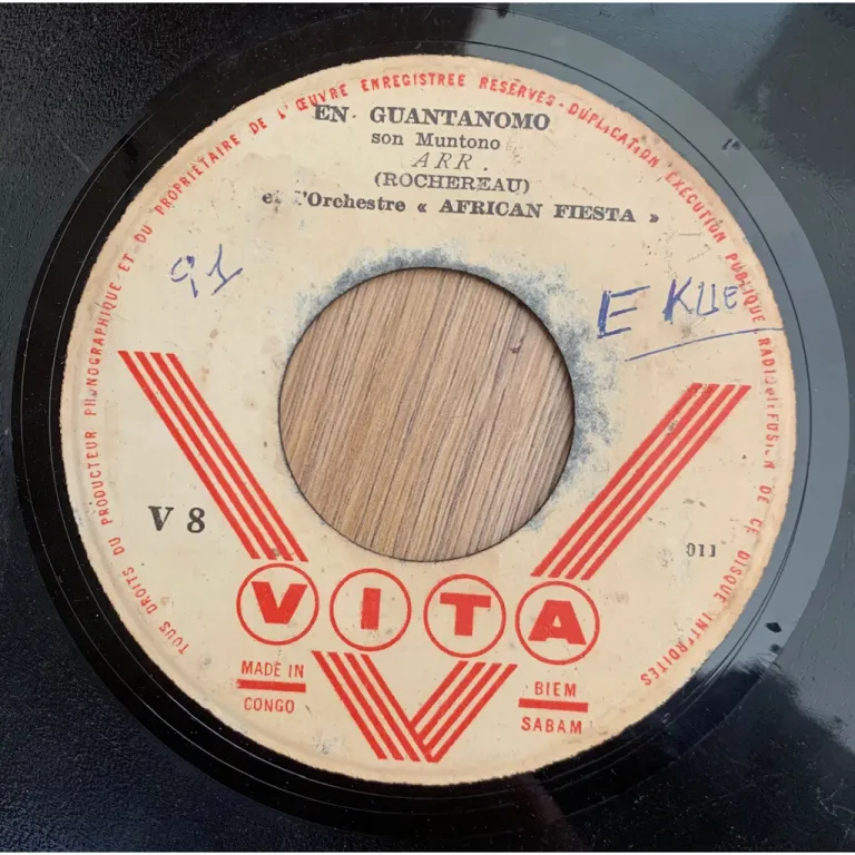 Son montuno Congolese style version of the track made famous by the Cuban orquesta Sensacion & a rumba on this ultra rare single only release by the legendary Congo singer & band.Wear, peel off & writings on labels. Record is weak G w/ numerous marks & constant strong to reasonable noise.
