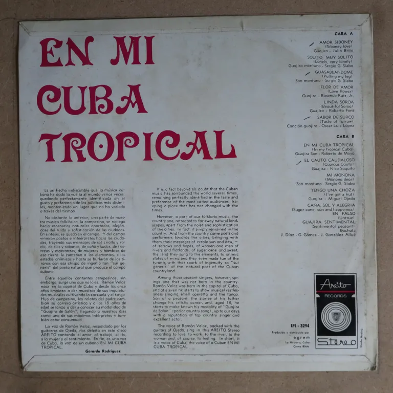 Killer Cuban guajiras & son montunos by the iconic 60's singer, Sleeve has minor wear, dirt & light ringwear on back, record looks very nice and has light to hardly any noise, some unremoveable dirt & few marks causing light clicks (as on B 2 clip 3), so varies from VG to EX depending on parts.