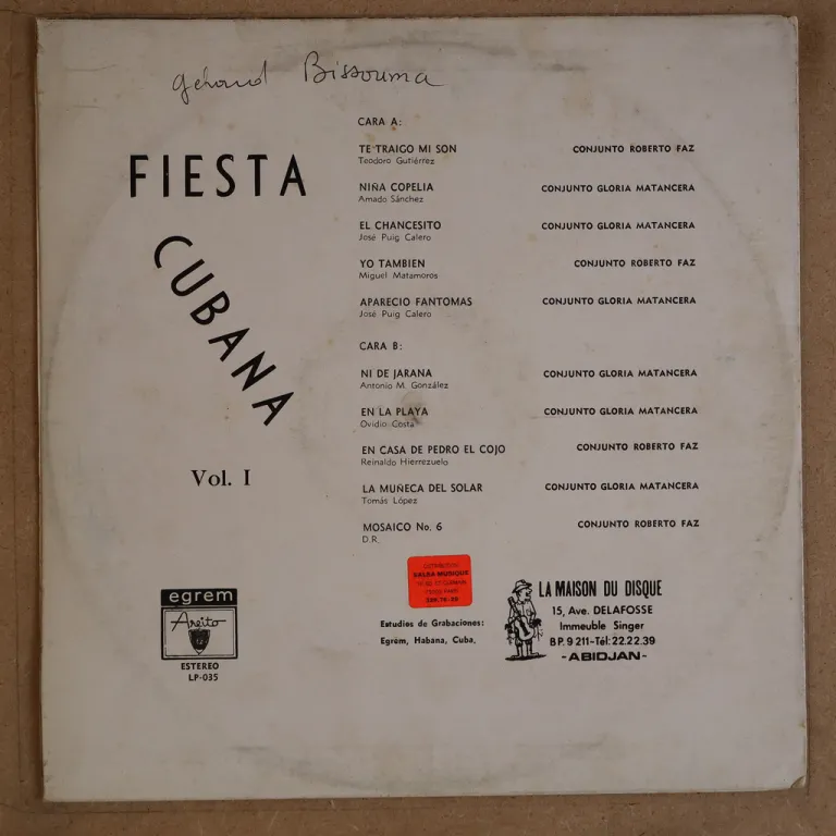 Afrocuban sounds on top on this scarce compilation specially released with Areito for the African market by an Ivory Coast producer. Features possibly exclusive tracks & previously released super rare material. Traklisting includes : Conjunto Gloria Matancera : "nina copelia", "el chancesito", "aparecio fantomas", "ni de jarana", "en la playa", "la muneca del solar" Conjunto Roberto Faz "te traigo mi son", "yo tambien", "en casa de pedro el cojo","mosaico n 6". Sleeve w/ some aging & dirt, ringwear, sticker on back, writings on cover & labels. Record in top shape.