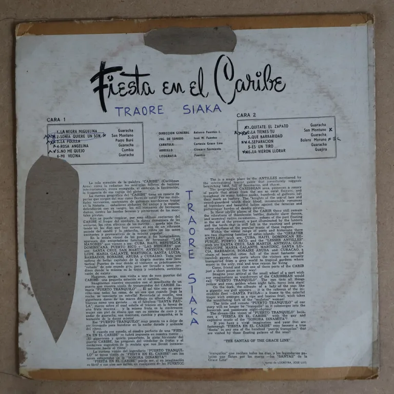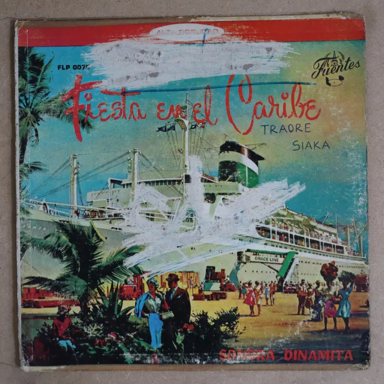 Colombian sones, guarachas & a great down tempo cumbia as recorded by one of the country's leading groups. Sleeve has strong wear, large peel off on front & back, split on all spine, 5" split on top, 1" split on bottom, brown paper tape along seams, writings on cover & labels. Record has mainly light to very light noise but a few more serious marks cause trouble, aprticularly on B6 (clip 3) which has multiple reasonable clicks.