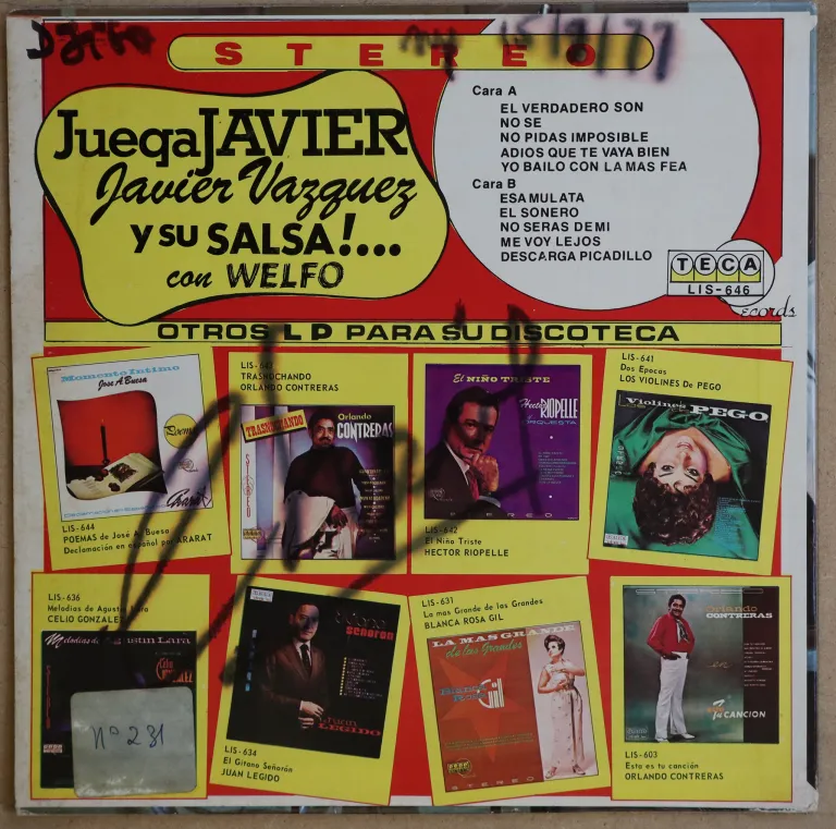 Early salsa / latin jazz lp, features "Descarga picadillo", "El verdadero son", "Esa mulata", sleeve has light aging & dirt, large writings on back, writings on A side label, record plays nicely with minor occasional super light noise.
