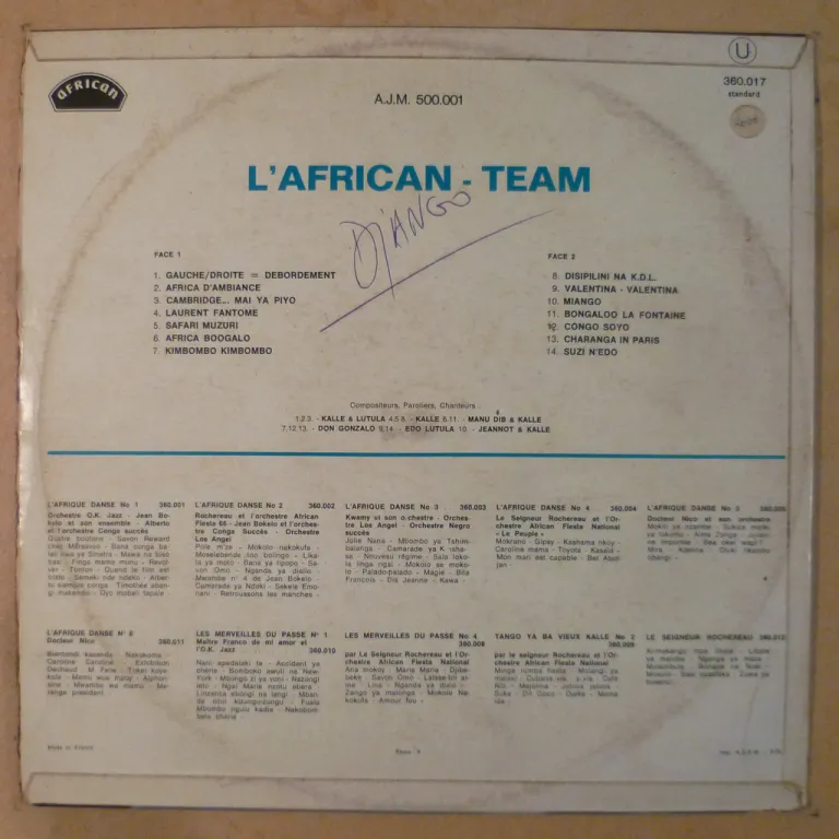 The afro-latin classic recorded by the Congo - Cuban / Cameroon dream team, features the latin soul "Africa boogaloo" & "congo soyo", the pachanga "kimbombo kimbombo" & charangas "Valentina-Valentina" & "Charanga in Paris". Red label original press. Some aging & dirt wear, writings on back, record has marks but plays with reasonable noise to hardly noticeable noise, solid VG- to VG/VG+ depending parts.