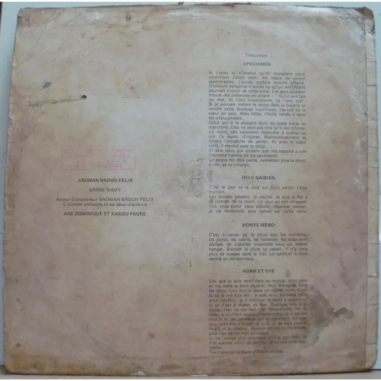 An afro latin tune Ivory Coast style on this raw Ivory Coast soukous & afro pop with psych hints. Sleeve has strong aging & dirt, split on all top, creases, rubber stamp & stains on back, writing residue on front & writings & wear on labels, record has cosntant strong noise from countless marks & has a 2,5" crack starting on center and reaching the edge running in diagonal through the side, though the crack doesn't cause additional noise.