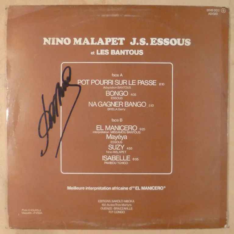 Feat. a cover of " El manicero " w/ sax solo & Jose Missamou on vocals & several rumbas compiled out of scarce material and highlighting Bantous saxophone players, Sleeve has light wear, shop sticker on front, large writings on back & labels, record plays greatly despite light marks w/ just very occasional noise.