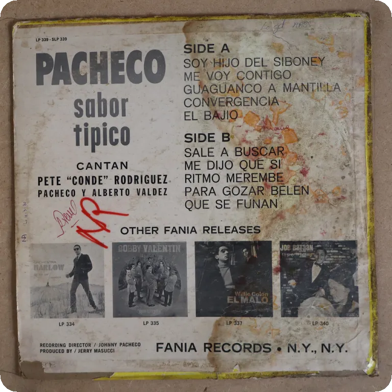 Several dancefloor tunes on this early salsa LP by the 2 giants. Mono original ! Dirt wear & aging, 5" split on top, 7" split on bottom, ringwear,creases, small writings on bottom back, record plays solid VG- to VG+ w/ marks & occasionally noticeable surface noise.