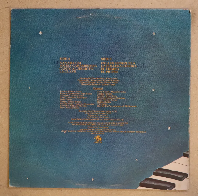 Dancefoor salsa winners on this early LP by Papo Luccca & his band, late 70's repress. Light beige water damage wear on bottom spine corner and along mouth on back, record in top shape w/ constant