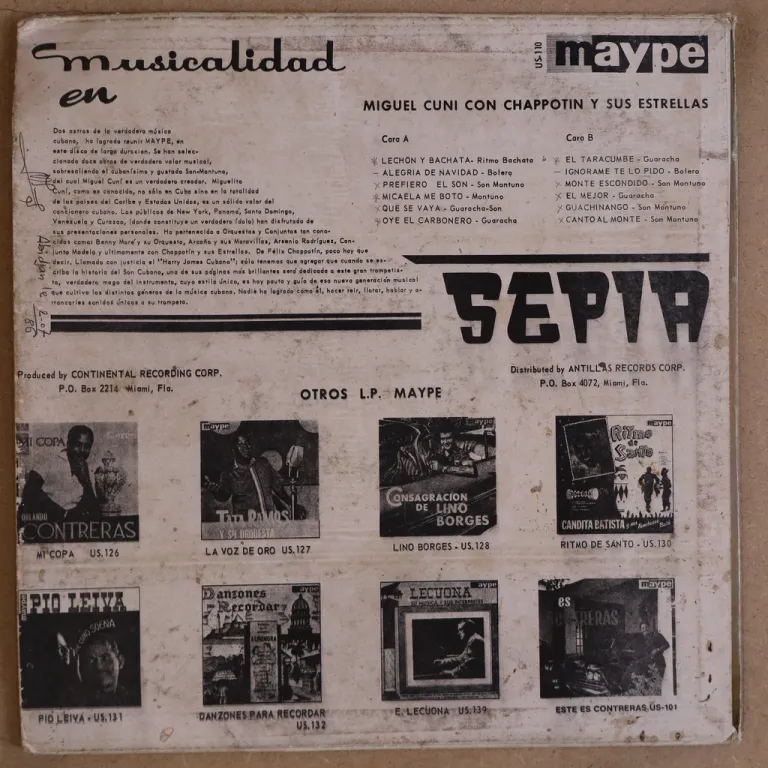 Sones & guarachas on top as recorded by the trumpet player & Cuban singer. Continental recording address on back so presumably a 70's repress. Some wear on cover, dirt, blue stains on front, writings on cover & labels,light warp on top mouth corner, mini peel off along mouth on back. Record has light to hardly noticeable noise from unremoveable dirt & marks