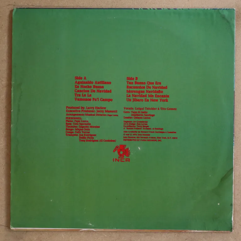 Dancefoor salsa winners on this early LP by Papo Luccca & his band, late 70's repress. Light beige water damage wear on bottom spine corner and along mouth on back, record in top shape w/ constant pressing noise.
