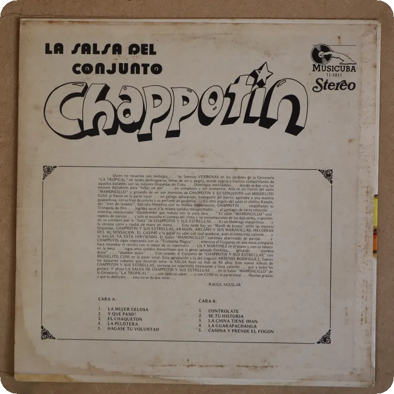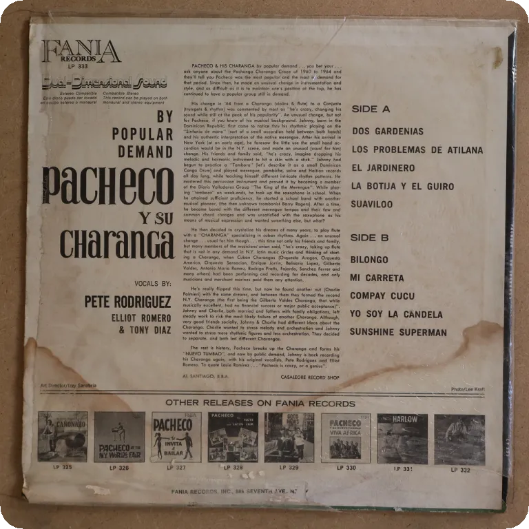 Bilongo & other winners on this classic charanga masterpiece by the flute legend. Early 70's stereo repress. Some wear, beige water amage & warp along bottom, mini writings on labels. Record in top